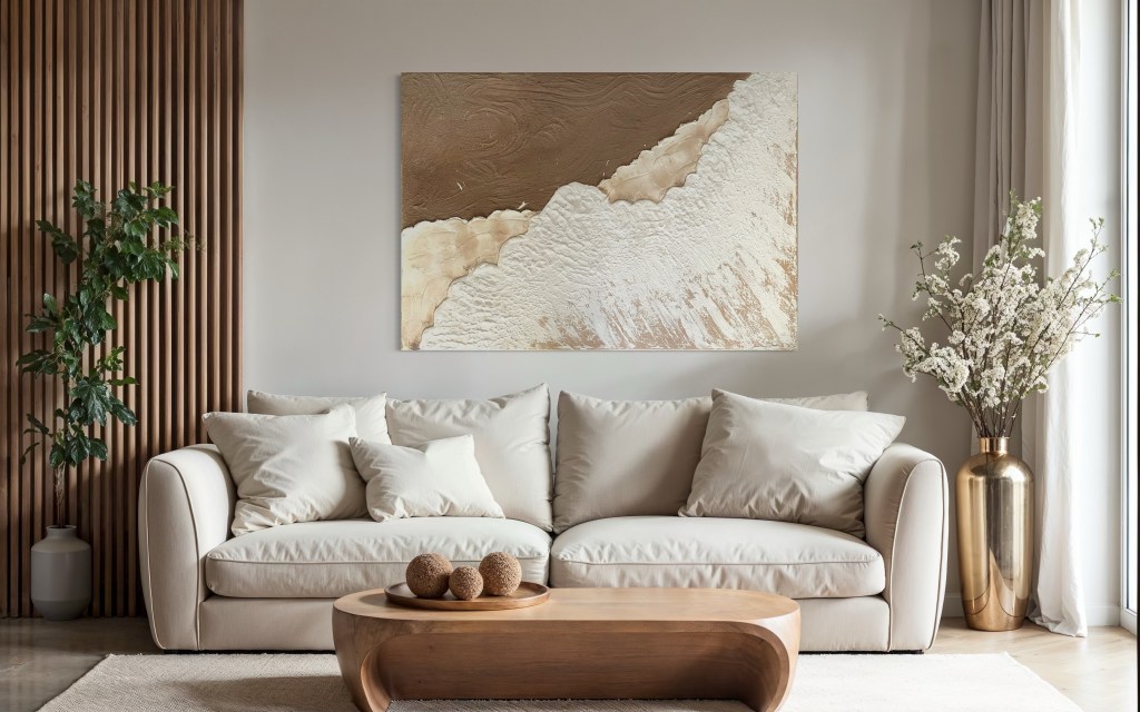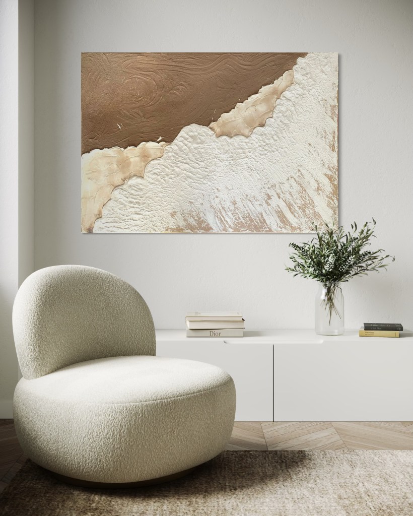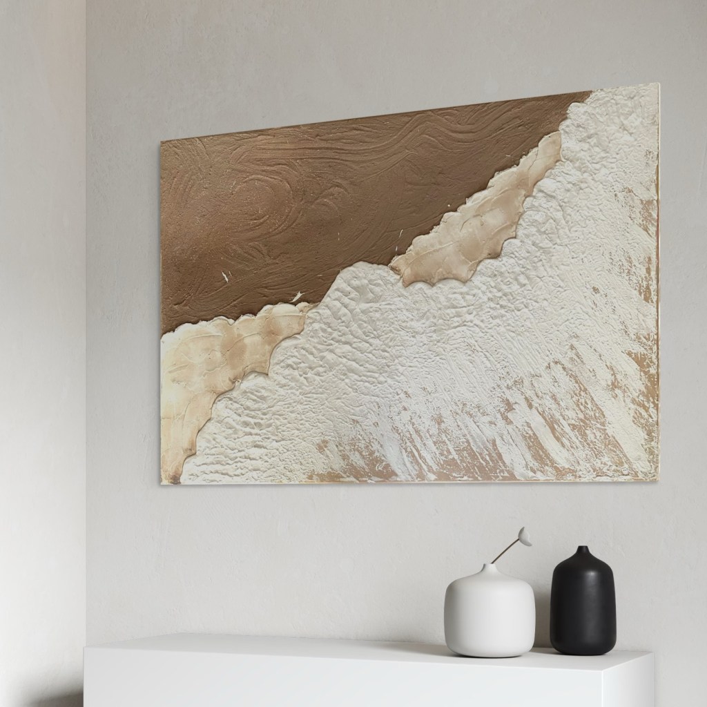 Die Gemälde ‚Grenzen des Meeres‘ strahlen eine besondere Balance zwischen Bewegung und Ruhe aus. Die natürliche Farbpalette, von erdigem Sandton bis hin zum fließenden Weiß der Welle, schafft eine organische Harmonie, die sich direkt auf die Atmosphäre eines Raumes überträgt.