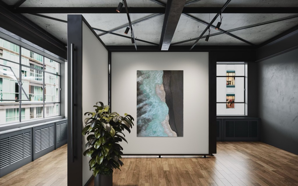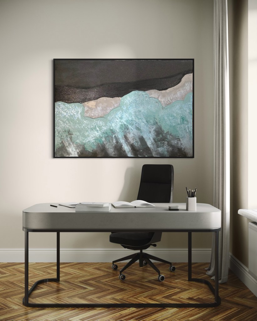 Emotional lädt „Küste der Schatten“ zum Innehalten ein: Es evoziert die Begegnung mit dem Meer als mystischen Ort, an dem Vergänglichkeit und Beständigkeit ineinanderfließen. Ein Bild, das gleichermaßen beruhigt wie inspiriert – und dem Raum eine leise, kraftvolle Tiefe verleiht.