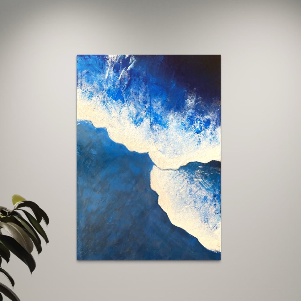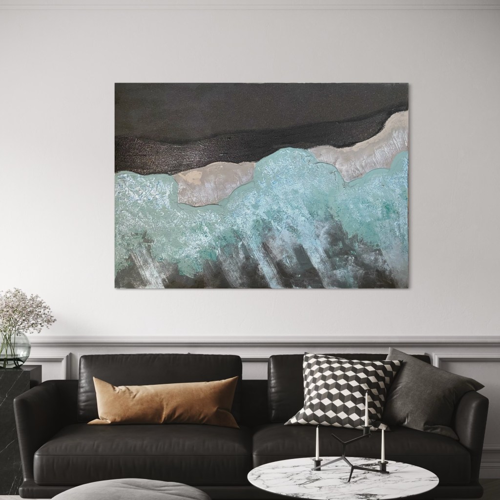 Die Oberfläche trägt eine feine Struktur, die das Wasser fast spürbar macht: Man kann das leise Rollen der Wellen erahnen, während die weichen Farbübergänge eine beruhigende Stille erzeugen. Dieses Zusammenspiel von Bewegung und Gelassenheit verleiht dem Raum eine atmosphärische Leichtigkeit.