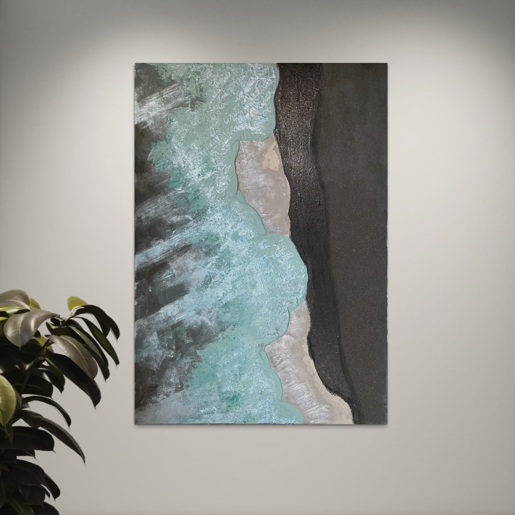„Küste der Schatten“ entfaltet ein Spannungsfeld zwischen Tiefe und Leichtigkeit. Die Farbpalette reicht von dunklem, fast geheimnisvollem Schwarz über silbrige Zwischentöne bis hin zu den schimmernden Blaugrün-Nuancen des Wassers. Dieses Zusammenspiel verleiht dem Bild eine markante Präsenz, die zugleich erdend und träumerisch wirkt.