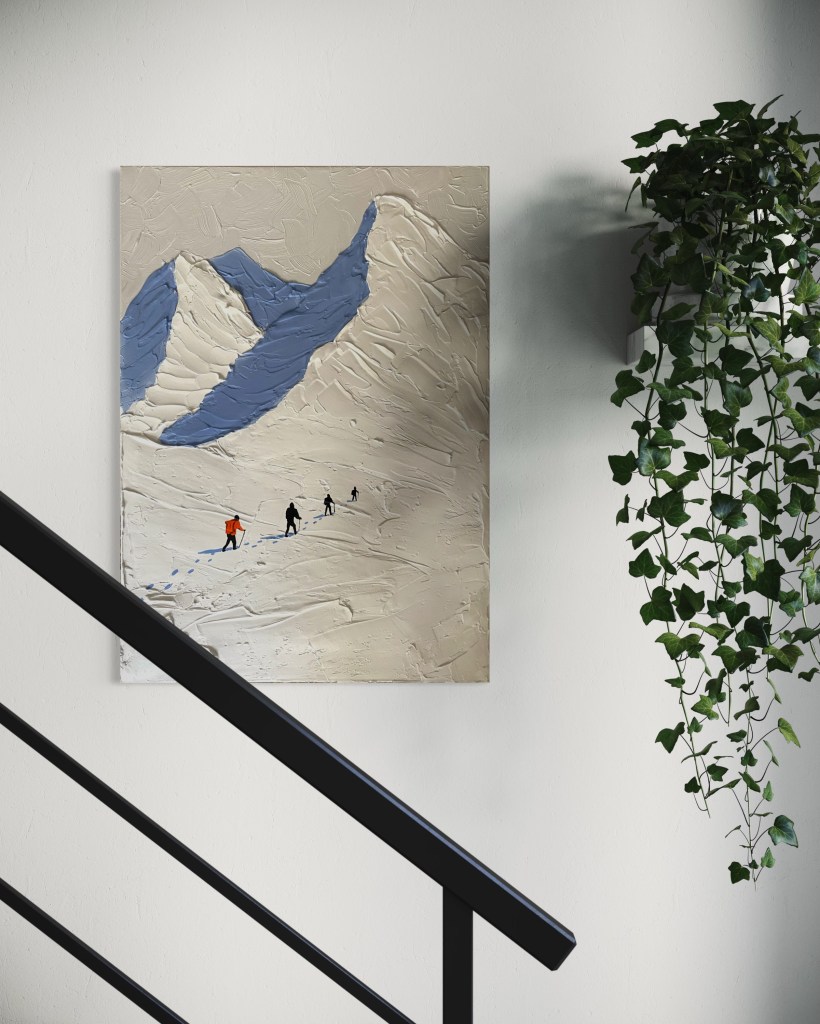 ‚Spuren im Eis‘ zeigt die stille Weite verschneiter Gipfel, durchzogen von den Spuren einer kleinen Gruppe von Bergsteigern. Die Impasto-Struktur fängt die raue Oberfläche von Schnee und Gletscher ein, während die kräftige, leuchtende Jacke eines Wanderers einen lebendigen Kontrast zur Kühle des Eises bildet. Das Werk erzählt von der Beziehung zwischen Mensch und Natur, von der Zerbrechlichkeit unserer Spuren in einer Landschaft, die unendlich größer und älter ist als wir selbst.