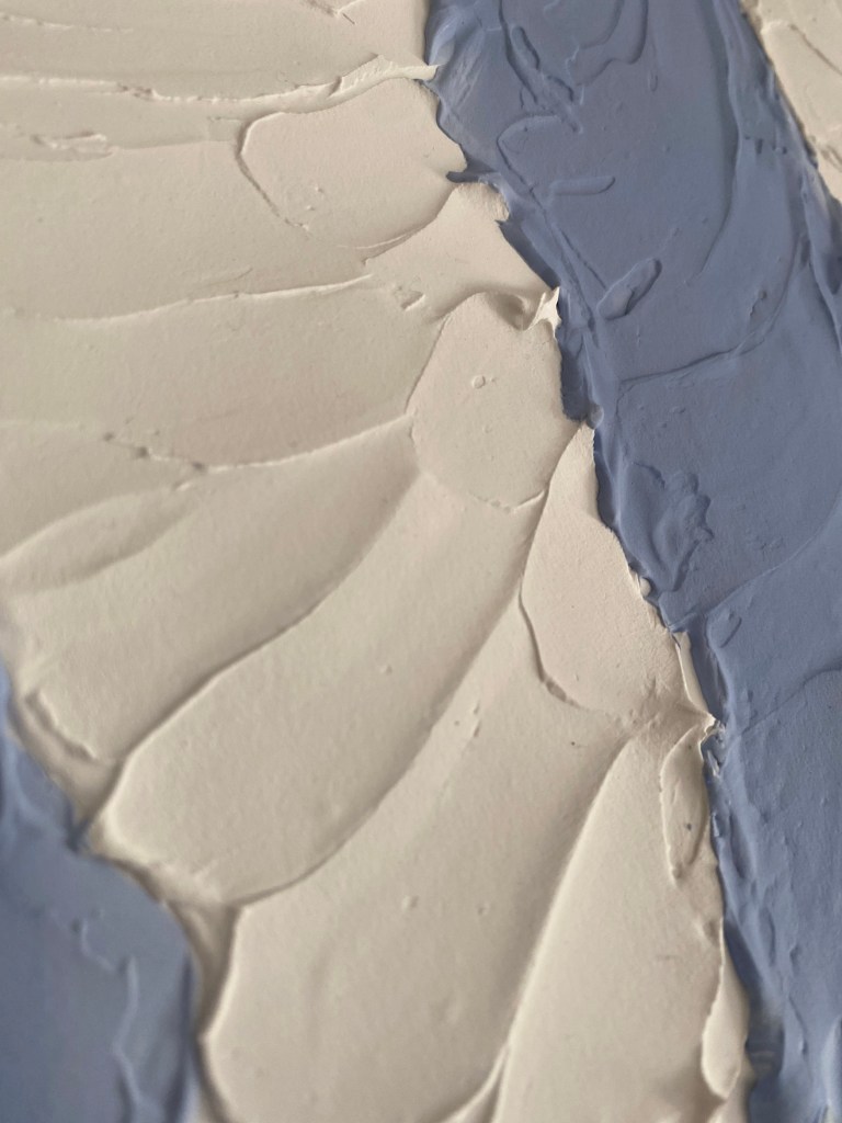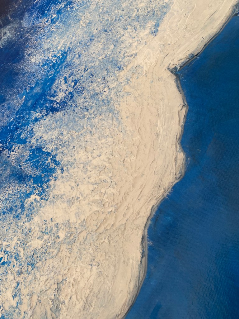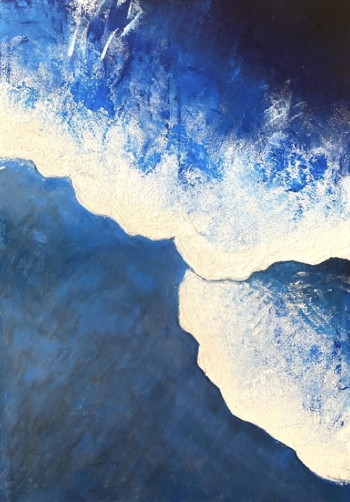 Das Gemälde “ Mitten im Ozean“ fängt die sanfte Energie des Meeres in einer harmonischen Farbpalette aus Blau- und Weißtönen ein. Zwei leichte Wellen ziehen in fließender Bewegung durch das Bild, ihre Formen verschmelzen mit den zarten Nuancen zu einer Komposition, die Ruhe und Lebendigkeit zugleich vermittelt.