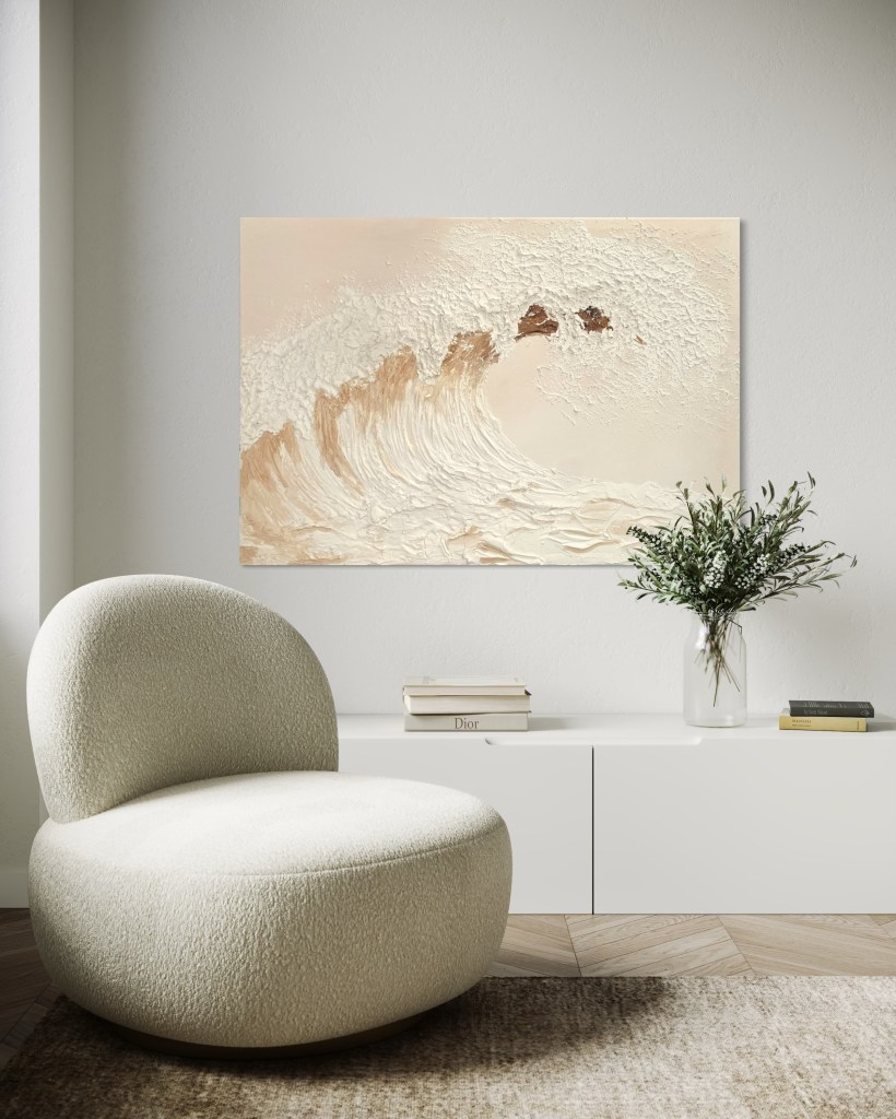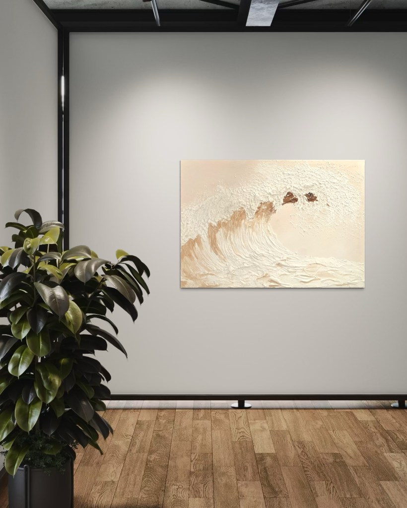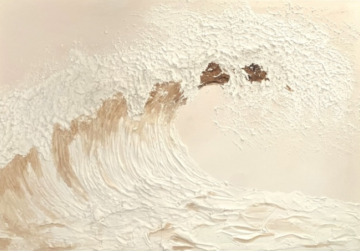 Das Gemälde „White Water“ verkörpert die fließende Kraft des Meeres in einer reduzierten, natürlichen Farbigkeit. Die sanften Beige- und Cremetöne verschmelzen mit dem reliefartigen Weiß der Welle zu einer Komposition, die gleichermaßen Klarheit wie Bewegung transportiert.